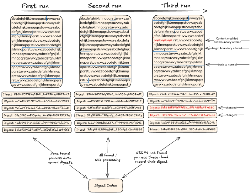 It uses a function to process the data and cut it into chunks of varying size…using the data itself to decide where to produce the cutpoints. This means that running the function on the same data twice produces the same cutpoints and the same series of chunks, but altering a single bit causes the cutpoint to be shifted in the stream and produce a different series of chunks. Since we still compute digests on chunks to record them in an index, the ones that are found are skipped and the others lead to new records.