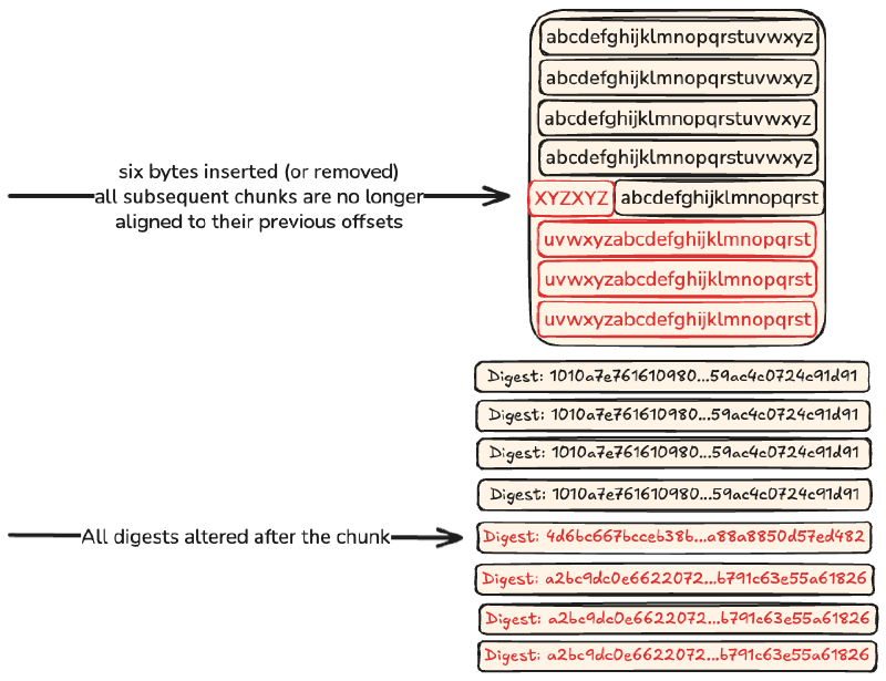 Because this is a rolling digest, if a change has caused a new cutpoint to be inserted, then after we have read a certain amount from this new cutpoint… the chunker resumes producing the same boundaries once the rolling window exits the modified region.