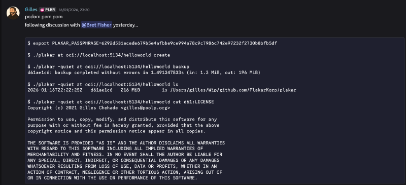 Even without prior knowledge of OCI registries, it took roughly half an hour to implement, which is a good demonstration of how easy it is to extend Plakar to new use cases.